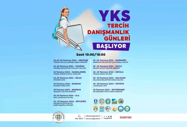 Muğla Büyükşehir Belediyesi, 2024 Yüksek Öğretim Kurumları Sınavı (YKS) tercihlerinde öğrencilere destek olmak amacıyla 13 ilçede ücretsiz danışmanlık hizmeti sunacak. Danışmanlık hizmetleri, 24 Temmuz’dan itibaren 10.00 ile 18.00 saatleri arasında uzman eğitmenler tarafından verilecek.