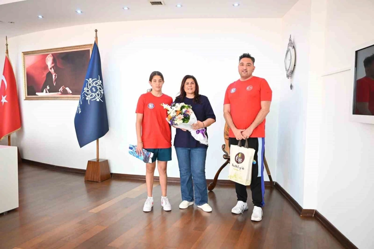 Aydın Büyükşehir Belediyesi Atatürk Spor Kompleksi’nde gerçekleştirilen eğitimler ile milli takıma giren genç yüzücü Nisan Ada Balkan, Büyükşehir Belediye Başkanı Özlem Çerçioğlu’nu makamında ziyaret etti. Aydın Büyükşehir Belediye Başkanı Özlem Çerçioğlu’na, Grand Prix Burgas 2025 Uluslararası Yüzme Şampiyonası 13-14 yaş kategorisinde 3’üncü olan Yüzme Milli Takımı sporcusu Nisan Ada Balkan ile Antrenör Aytekin Mindan ziyarette bulundu. Yarışmaya katılan 250 sporcu arasından gösterdiği başarı ile Aydın’ın gururu olan Nisan Ada Balkan, desteklerinden dolayı Aydın Büyükşehir Belediye Başkanı Özlem Çerçioğlu’na teşekkür etti. Efeler ilçesi Kemer Mahallesi’nde bulunan Büyükşehir Belediyesi Atatürk Spor Kompleksi’nde sağlanan imkanlar ve gerçekleştirilen antrenmanlar ile Milli Takıma girmeye hak kazandığını belirten Balkan, "Antrenmanlarımızı Atatürk Spor Kompleksi’nde yapıyoruz. Yarışlar 50 metrelik havuzlarda yapılıyor; Kuşadası’nda 25 metrelik küçük bir havuzda yüzme imkanımız var o yüzden Atatürk Spor Kompleksi’nde bulunan 50 metrelik havuz bize kendimizi geliştirmek adına bayağı bir katkı sağlıyor. Başarımız, Aydınımızı temsil etmek bizlere gurur veriyor. Özlem Başkanımıza çok teşekkür ederiz, gerçekten Atatürk Spor Kompleksi çok güzel. Bir tesiste aradığımız her şeyi burada bulabiliyoruz" diye konuştu. Geleceğin şampiyonları Aydın Büyükşehir Belediyesi’nin destekleri ile yetişiyor