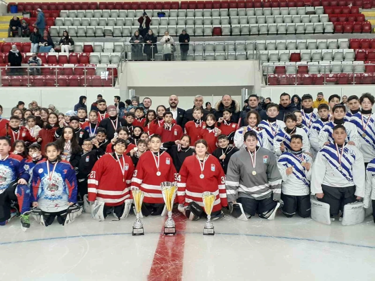 Koordinatörlüğünü Fatih Arslan ile Ferhat Doğuş Aygün’ün üstlendiği Buz Hokeyi Liginde dereceye giren takımlar kupa ve madalya kazanmanın coşkusunu yaşadı. Erzurum Gençlik ve Spor İl Müdürü Levent Çakmur, EİT 2025 Buz Hokeyi Maçlarına katılan takımları ve antrenörlerini tebrik etti.