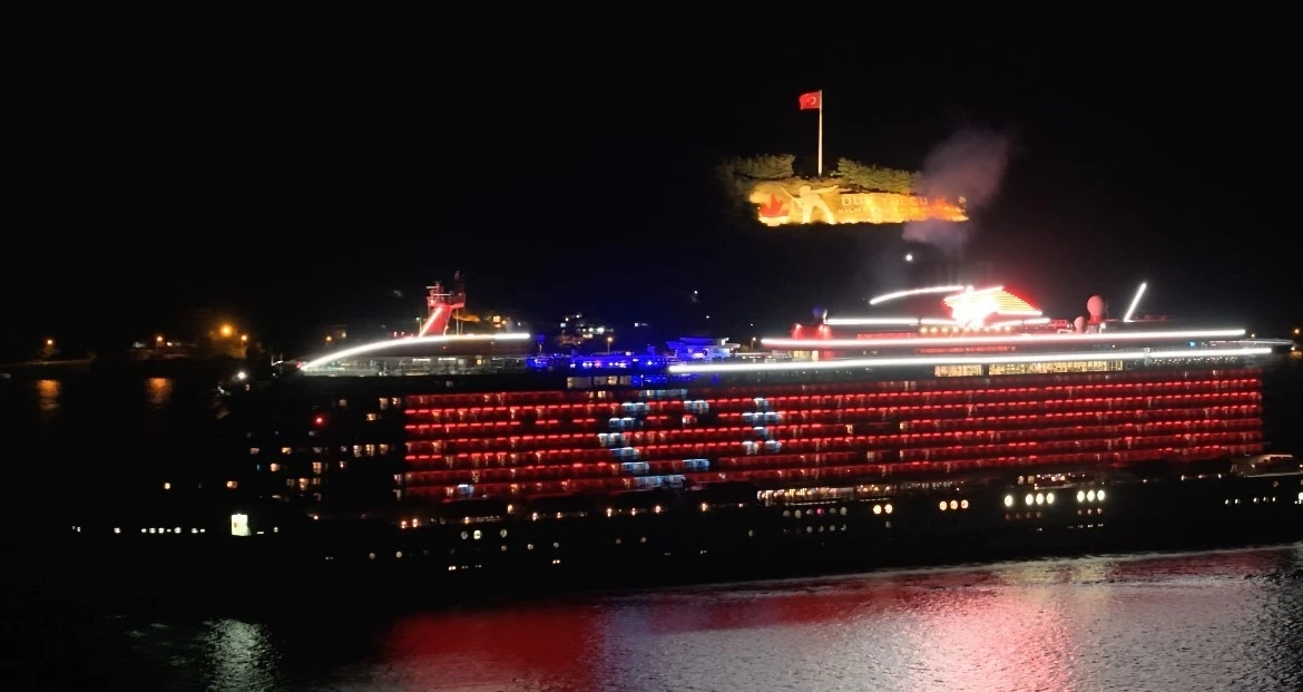 Çanakkale Boğazı’ndan geçen Bahamalar bayraklı ’Resilient Lady’ isimli kruvaziyer gemisi gövdesindeki ışıklarla Türk bayrağı oluşturdu.