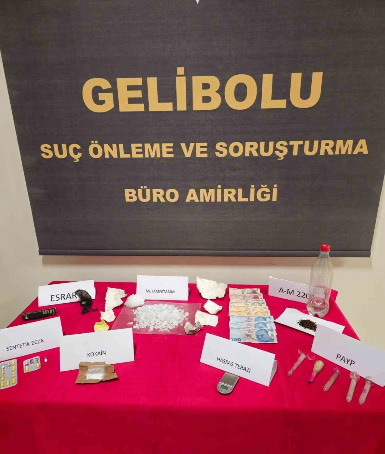Çanakkale İl Emniyet Müdürlüğü Gelibolu ilçe Emniyet Müdürlüğü ekiplerince uyuşturucu madde satışını ve kullanımını engellemeye yönelik yapılan çalışmalarda bir araç içerisinde yapılan aramada 9 fişek halinde 7 gram metamfetamin ve fanus içerisinde toplam 480 gram gelen metamfetamin uyuşturucu madde, fişek halinde 2 gram esrar tohumu, fişek halinde 1.33 gram Kokain, pet şişe içerisinde 190 gram likit uyuşturucu madde, 5 gram likit uyuşturucu madde sıkılan esrar, 11 sentetik uyuşturucu hap maddesi, 5 Payp olmak üzere yaklaşık tahmini değeri 2 milyon TL’lik uyuşturucu madde ele geçirildi. Şüpheli M.B. (36) gözaltına alındı. Şüphelinin emniyetteki işlemleri devam ediyor.