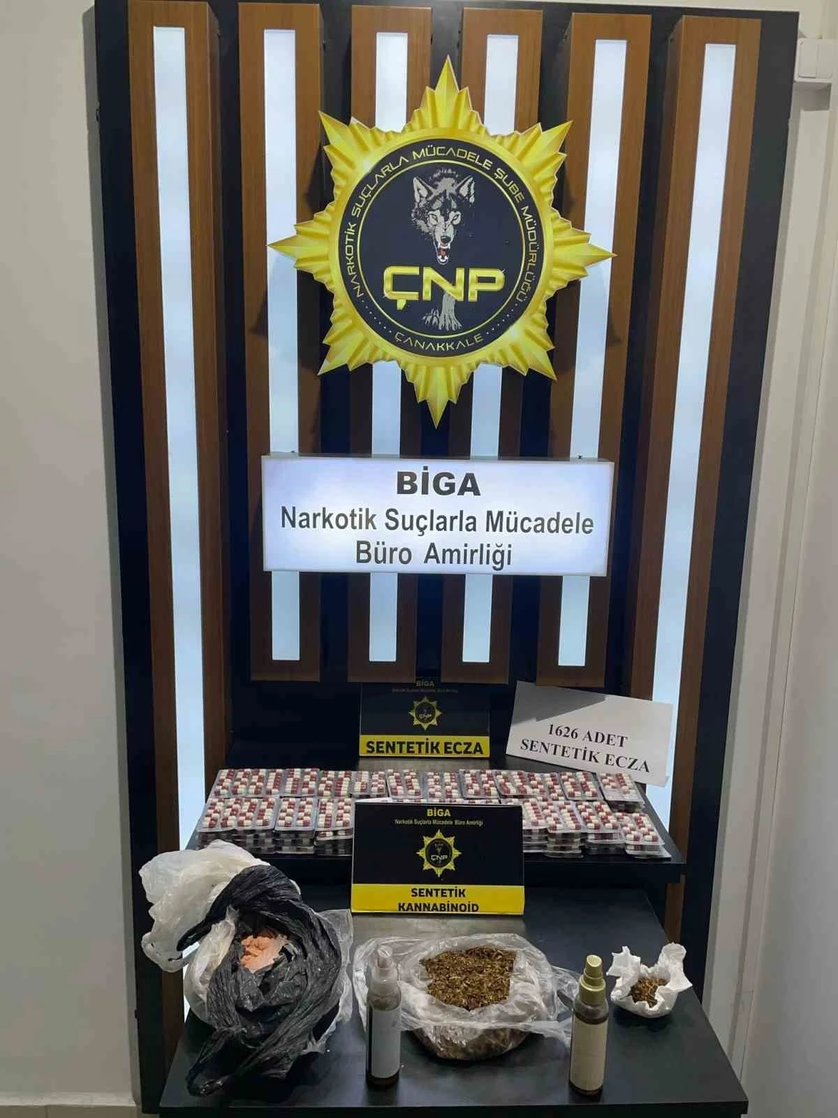 Çanakkale İl Emniyet Müdürlüğü Narkotik Suçlarla Mücadele Şube Müdürlüğü ekiplerince Biga ilçesinde uyuşturucu satışı ve kullanımının önlenmesine yönelik operasyon düzenlendi. Operasyonda E.Y. isimli şahsın adresinde bin 626 adet sentetik ecza, 1 kilogram 212 gram toz ecstasy, 2 parça halinde 131,99 gram sentetik kannabinoid ile 2 parça halinde 234 gram uyuşturucu madde yapımında kullanıldığı değerlendirilen sıvı madde ele geçirildi. Şüpheli E.Y. gözaltına alındı.