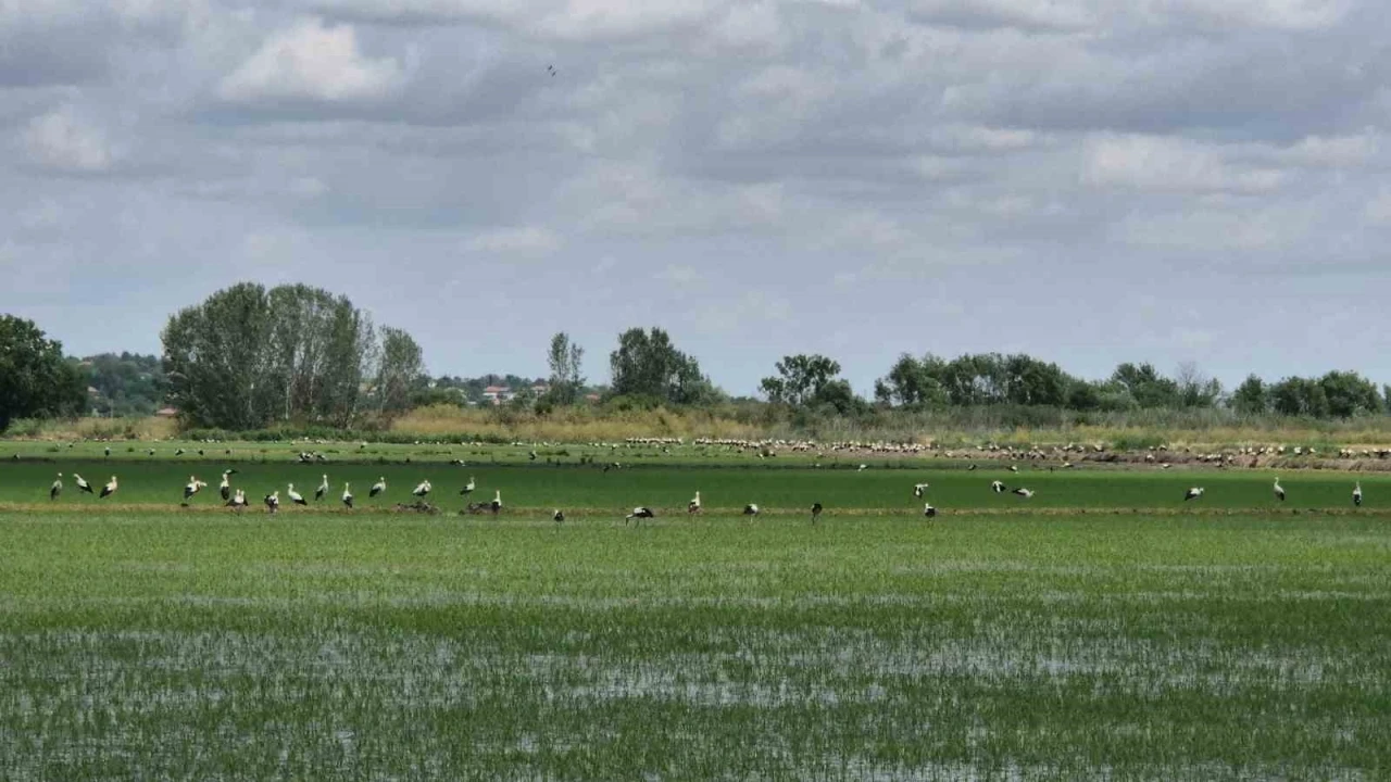 Tarlalarda çekilen görüntülerde leyleklerin kimi zaman kümeler halinde beslendiği, kimi zaman ise kanat çırparak çeltik tarlaları üzerinde süzüldüğü anlar yer aldı.