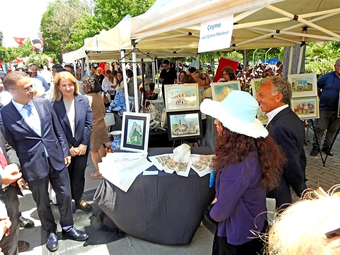 Çeşme Halk Eğitim Merkezi de ilçenin tarihi ve kültürel mirasını yansıtan suluboya resimler ve seramik eserlerle sergideki yerini aldı. Kurs eğitmeni Deniz Deviren rehberliğinde hazırlanan çalışmalar, ziyaretçiler tarafından büyük beğeni topladı. Sergiye Çeşme Halk Eğitim Merkezi Müdürü Ali Rıza Doğruyol, kurs eğitmeni ve kursiyerler de katıldı.