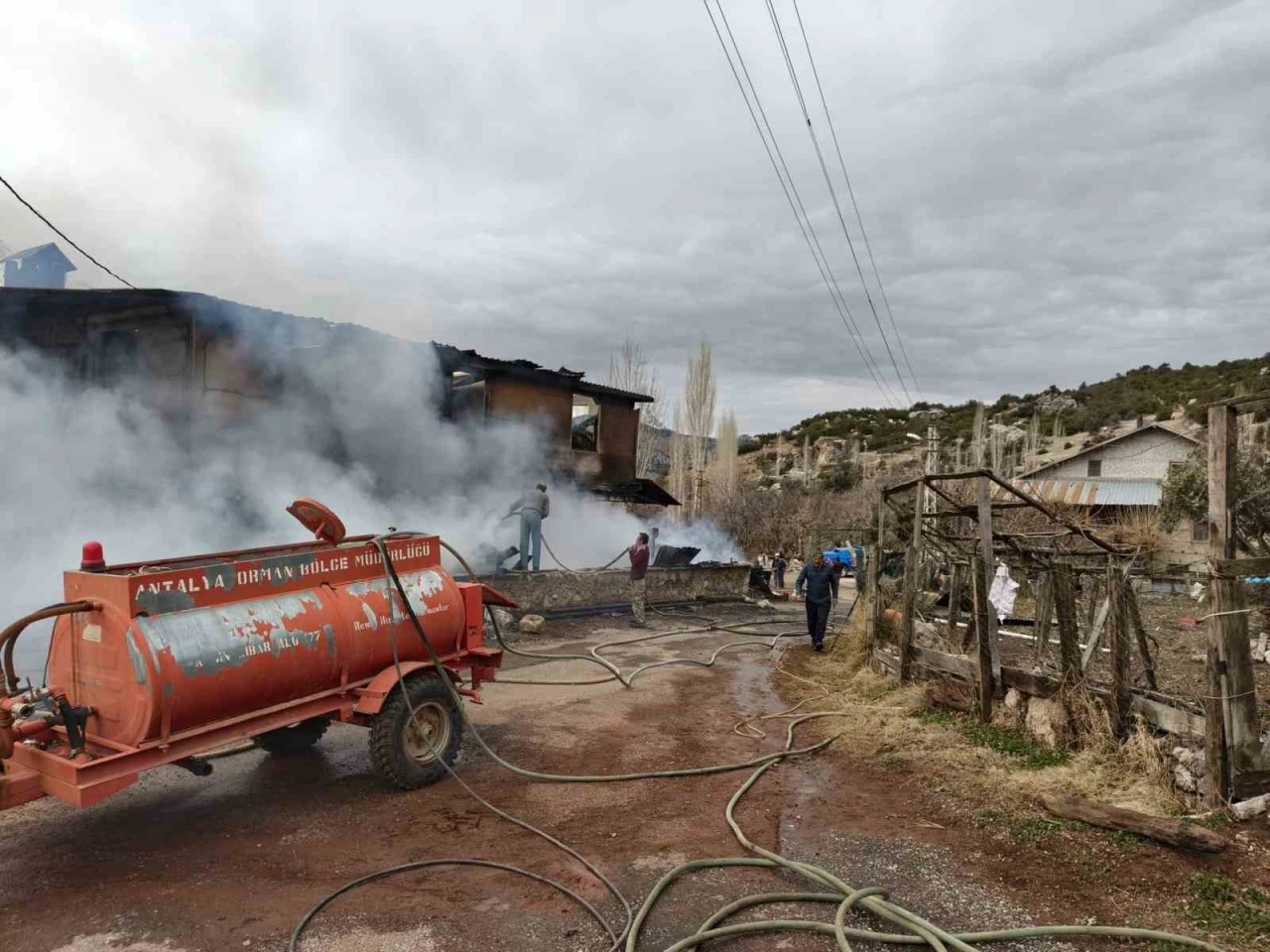 Çobanların ihbarı üzerine bölgeye itfaiye ve orman ekipleri yönlendirilirken, Antalya Büyükşehir Belediyesi’ne ait itfaiye aracının, olay yerine 35 kilometre mesafedeki Ortaköy Mahallesi altında arıza yapması müdahaleyi geciktirdi. Alevlere ilk müdahaleyi Orman İşletme Müdürlüğü’ne ait yangın araçları yaparak soğutma çalışması gerçekleştirdi. Evleri tamamen yanan ve eşyaları kül olan aileye komşuları yardımcı oldu.