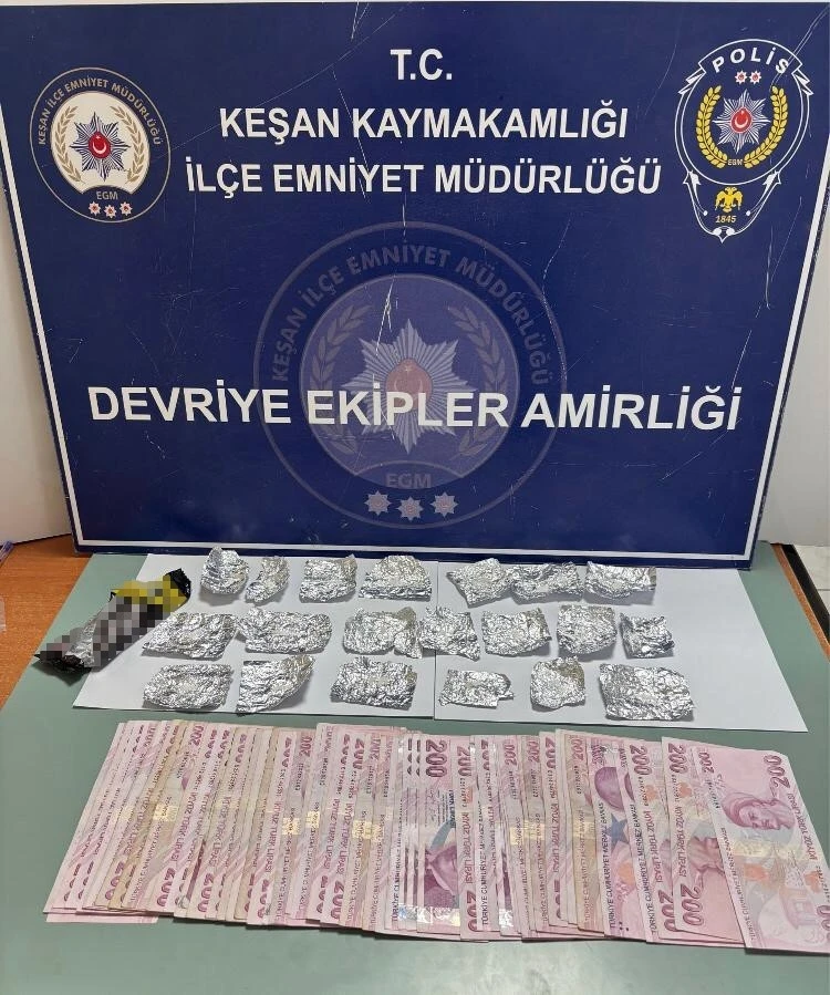 Alınan bilgiye göre, Keşan İlçe Emniyet Müdürlüğü ekipleri, Yeni Mescit Mahallesi Koru Sokak üzerinde durumundan şüphelendikleri A.Ö.’yü durdurdu. A.Ö.’nün üst aramasında, boş çikolata paketine saklanmış halde 20 adet alüminyum folyo içerisinde 3,45 gram uyuşturucu ile uyuşturucu satışından elde edildiği değerlendirilen 10 bin 400 TL ele geçirildi. Gözaltına alınan A.Ö. hakkında adli işlem başlatıldı.