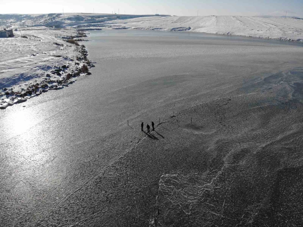 Doğu Anadolu’nun en büyük 2’inci gölü olan, Çıldır Gölü’nün bir kısmı dondu. Mavi ile beyazın buluştuğu donan Çıldır Gölü havadan görüntülendi.