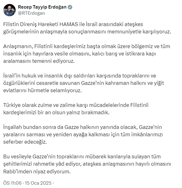 Gazze halkına olan desteğini bir kez daha vurgulayan Cumhurbaşkanı Erdoğan, "İsrail’in hukuk ve insanlık dışı saldırıları karşısında topraklarını ve özgürlüklerini cesaretle savunan Gazze’nin kahraman halkını ve yiğit evlatlarını hürmetle selamlıyoruz. Türkiye olarak zulme ve zalime karşı mücadelelerinde Filistinli kardeşlerimizi bir an olsun yalnız bırakmadık. İnşallah bundan sonra da Gazze halkının yanında olacak, Gazze’nin yaralarını sarması ve yeniden ayağa kalkması için tüm imkânlarımızı seferber edeceğiz. Bu vesileyle Gazze’nin topraklarını mübarek kanlarıyla sulayan tüm şehitlerimizi rahmetle yâd ediyor, ateşkes anlaşmasının hayırlı olmasını Rabb’imden niyaz ediyorum" dedi.