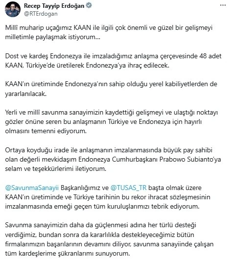 Cumhurbaşkanı Recep Tayyip Erdoğan, sosyal medya hesabından yaptığı açıklamada, Endonezya ile yapılan dev savunma sanayi ihracat sözleşmesinin detaylarını paylaştı. Erdoğan, dost ve kardeş ülke Endonezya ile imzalanan anlaşma çerçevesinde, 48 adet KAAN’ın Türkiye’de üretilerek Endonezya’ya ihraç edileceğini duyurdu.