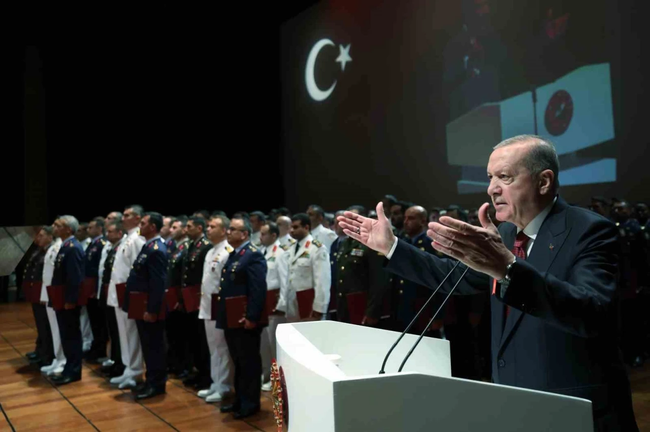 Cumhurbaşkanı Recep Tayyip Erdoğan, Milli Savunma Üniversitesi Kurmay Subaylar Mezuniyet Töreni’nde yaptığı konuşmada, "Geçmişin siper savaşlarının yerini bugün artık siber savaşlar almış durumda. Hem bölgemizde hem dünyada yeni denklemler kurulurken jeopolitik dinamikler de büyük oranda değişim ve dönüşüme uğruyor. Bu yeni gerçeklikte ülkemizin güçlü şekilde var olması, yeni sistemde kutup başı olarak yerini alması için elimizden gelen bütün çabayı gösteriyoruz. Terörsüz Türkiye’ ve ‘terörsüz bölge’ hedeflerimize doğru kararlı, ümitli ve dikkatli bir şekilde ilerliyoruz" dedi. Cumhurbaşkanı Recep Tayyip Erdoğan, Milli Savunma Üniversitesi Kurmay Subaylar Mezuniyet Töreni’ne katıldı. Cumhurbaşkanı Erdoğan burada yaptığı konuşmada, "Bugün 80’i kardeş ülkelerden 241 subayımızı mezun ediyoruz.
