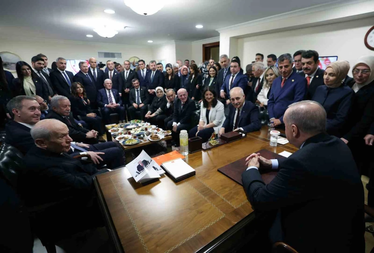 Meclis Başkanı Kurtulmuş ve MHP Genel Başkanı Bahçeli, daha sonra Cumhurbaşkanı Erdoğan’ı Meclis’ten uğurladı.