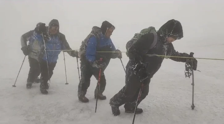 Birçok farklı ülkeden gelip Ağrı Dağı’na çıkmak için buluşan yabancı turistler kar, sis ve fırtınaya rağmen zirve yaptı.