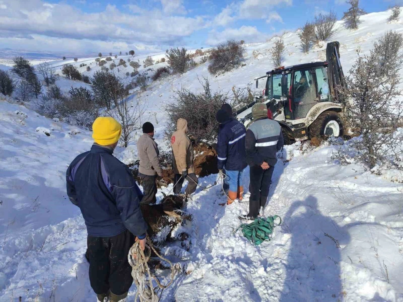 Ankara’da etkili olan kar yağışı Akyurt ilçesinde büyükbaş hayvanların mahsur kalmasına sebep oldu. Akyurt Belediyesi ekiplerinin çalışmaları sonucu kurtarıldı.