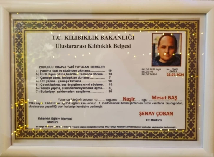 Belgede ayrıca, “2345 sayılı Kılıbıklık ve Light’lık Eğitim Kanunu’nun 1. maddesindeki bütün şartları en üstün vasıflarla taşıdığından uluslararası geçerliliği olan bu belge kendisine verilmiştir. Ev Müdürü Şenay Çoban” notu düşüldü.