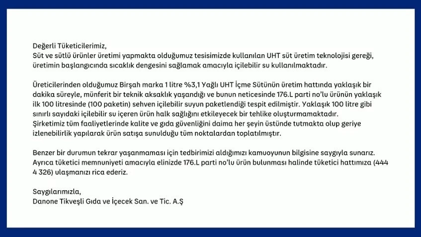 "Süt ve sütlü ürünler üretimi yapmakta olduğumuz tesisimizde kullanılan UT süt üretim teknolojisi gereği, üretimin başlangıcında sıcaklık dengesini ağlamak amacıyla içilebilir su kullanılmaktadır. Üreticilerinden olduğumuz Birşah marka 1 litre yüzde 3,1 Yağı UHT İçme Sütünün üretim hattında yaklaşık bir dakika süreyle, münferit bir teknik aksaklık yaşandığı ve bunun neticesinde 176.L parti no’lu ürünün yaklaşık ilk 100 litresinde (100 paketin) sehven içilebilir suyun paketlendiği tespit edilmiştir. Yaklaşık 100 litre gibi sınırlı sayıdaki içilebilir su içeren ürün halk sağlığını etkileyecek bir tehlike oluşturmamaktadır. Şirketimiz tüm faaliyetlerinde kalite ve gıda güvenliğini daima her şeyin üstünde tutmakta olup geriye izlenebilirlik yapılarak ürün satışa sunulduğu tüm noktalarda toplatılmıştır."