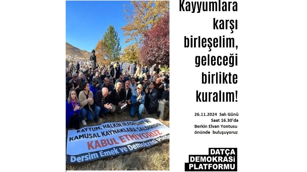 Muğla’nın Datça Demokrasi Platformu, kayyum atamalarına karşı tepkisini göstermek ve demokrasiye sahip çıkmak amacıyla 26 Kasım Salı günü saat 16.30'da tüm Datçalıları Berkin Elvan Yontusu önünde buluşmaya davet etti. Platform, son dönemde Hakkari, Esenyurt, Mardin, Batman, Halfeti, Dersim ve Ovacık gibi birçok belediyede seçilmiş belediye başkanlarının görevlerinden alınarak yerine kayyum atanmasına karşı ortak bir duruş sergilemek istiyor.