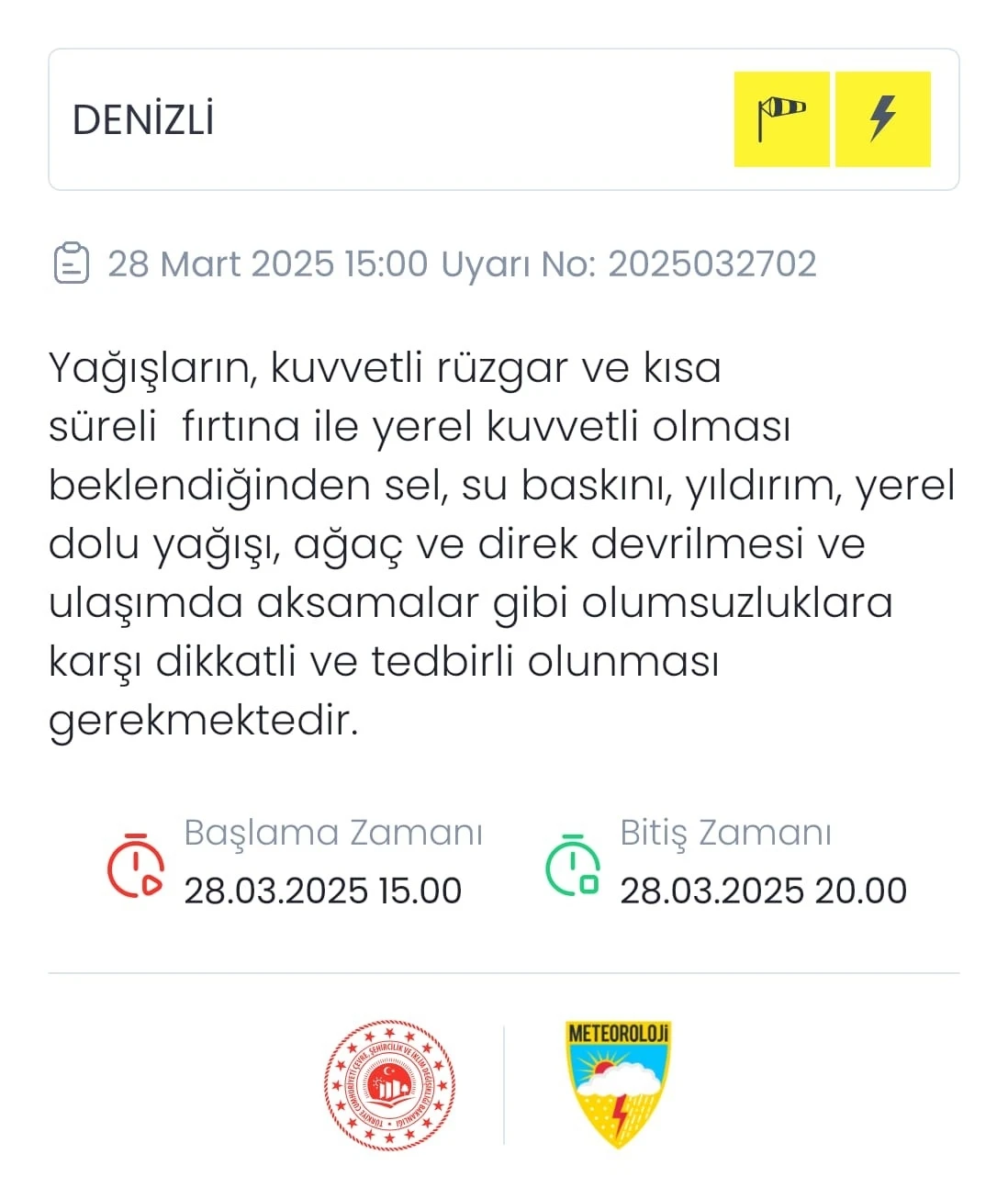 Denizli’de bugünden itibaren yağışlı havanın etkisi altına girmesi beklenirken, yağışların bayram süresince aralıklı devam etmesi bekleniyor. Meteoroloji 5. Bölge Müdürlüğü Tahmin ve Erken Uyarı Merkezi yapılan son değerlendirmelere göre; Uşak ve Denizli’de 28 Mart 2025 Cuma günü bölgenin kuzeyinde görülecek gök gürültülü sağanak yağışların, güneyli kuvvetli rüzgar ve kısa süreli yer yer fırtına (50-75 km/saat) ile beklendiği belirtildi. Bugün beklenen yağışlar sonucunda Meteoroloji 5. Bölge Müdürlüğü yerel kuvvetli olması beklendiğinden ani sel, su baskını, yıldırım, yerel dolu yağışı ve ulaşımda aksamalar gibi olumsuzluklara karşı dikkatli ve tedbirli olunması konusunda uyarılarda bulundu. Aynı zamanda Meteoroloji 5. Bölge Müdürlüğü Tahmin ve Erken Uyarı Merkezi yapılan son değerlendirmelere göre; Afyonkarahisar, Uşak ve Denizli illeri bölgesinin 28 Mart Cuma gününden itibaren yağışlı havanın etkisi altına gireceği belirtilirken mevsim normallerinin oldukça üzerinde seyreden hava sıcaklığını Arife gününden itibaren azalacağı ve mevsim normallerinin biraz üzerinde seyredeceği tahmin edildiği belirtildi. Ramazan Bayramında Hava Durumu