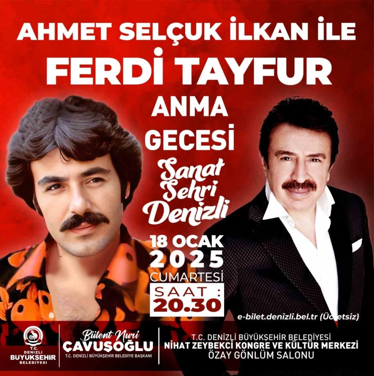 Denizli Büyükşehir Belediyesi, geçtiğimiz günlerde hayatını kaybeden ünlü şarkıcı Ferdi Tayfur için anma konseri düzenliyor. 18 Ocak Cumartesi günü unutulmaz şarkıların söz yazarı Ahmet Selçuk İlkan’ın da yer alacağı özel etkinliğe tüm vatandaşlar davet edildi. Denizli Büyükşehir Belediyesi, Arabesk müziğin güçlü ismi Ferdi Tayfur’u ölümünün hemen ardından düzenleyeceği özel bir programla anacak. Ferdi Tayfur anma konseri, 18 Ocak Cumartesi saat 20.30’da Nihat Zeybekci Kongre ve Kültür Merkezi Özay Gönlüm Salonu’nda kaleme aldığı unutulmaz şarkı sözleri ve şiirleri seslendiren Ahmet Selçuk İlkan’ın yer alacağı etkinlik ile yâd edilecek. Usta isim Ferdi Tayfur sevenlerinin buluşacağı etkinliğin ücretsiz olduğu, vatandaşların Büyükşehir Belediyesi’nin internet adresinden rezervasyon yaptırabileceği belirtildi.