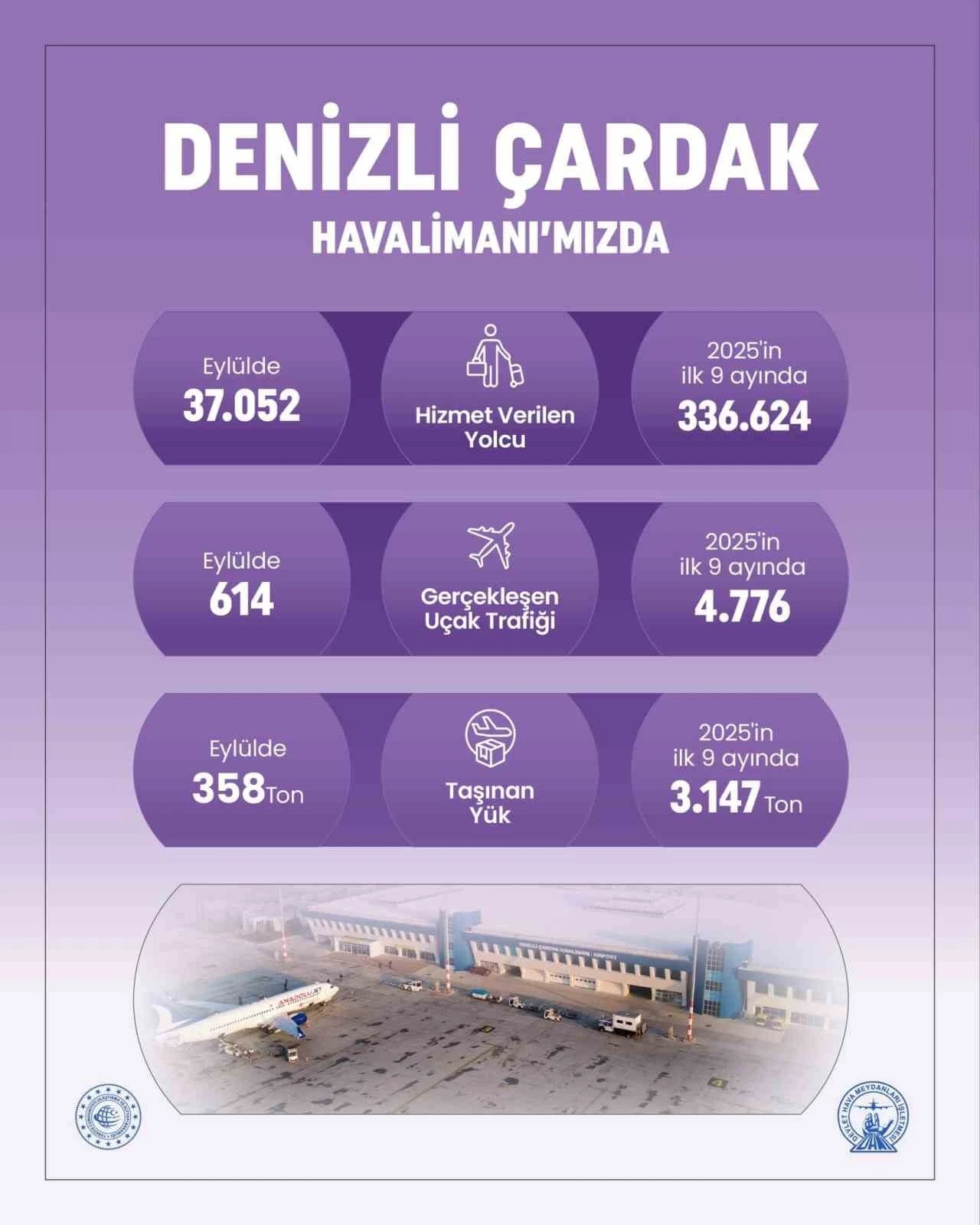 Devlet Hava Meydanları İşletmesi (DHMİ) verilerine göre Denizli Çardak Havalimanı, 2025 yılının ilk 9 ayında 336 bin 624 yolcuya, 4 bin 776 uçak trafiğine ve 3 bin 147 ton yüke ev sahipliği yaptı.