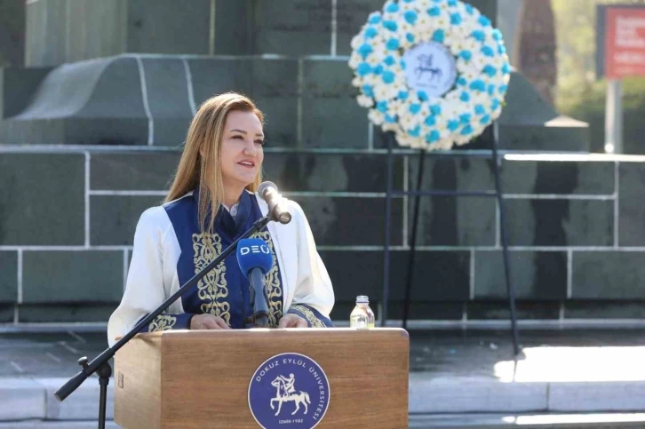 Türkiye’nin köklü eğitim kurumlarından olan Dokuz Eylül Üniversitesinin (DEÜ) 2023-2024 akademik yılı açılışı nedeniyle İzmir Cumhuriyet Meydanı’nda bir tören düzenlendi. Atatürk anıtına çelenk sunulmasıyla başlayan törende, DEÜ Rektörü Prof. Dr. Nükhet Hotar tarafından bir konuşma gerçekleştirildi. Üniversite üst yönetimi, akademisyenler ve öğrencilerin katıldığı çelenk sunma töreninde, DEÜ’nün uluslararasılaşma hedefleri ve yaptığı hizmetler vurgulandı.