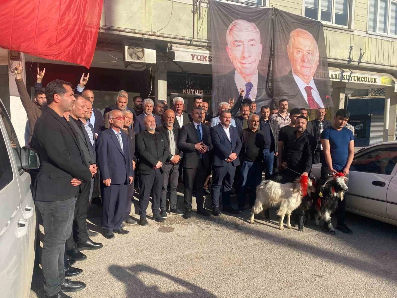 MHP Genel Başkanı Devlet Bahçeli’nin 6 Şubat’ta geçirdiği operasyonundan 66 gün sonra sağlığına kavuşması ve mesaisine başlaması nedeniyle Adıyaman İl Başkanlığı tarafından MHP’nin üç hilalini temsilen adak olarak belirlenen 3 koç kesilerek, parti binasının önünde vatandaşlara tatlı ikramında bulunuldu.
