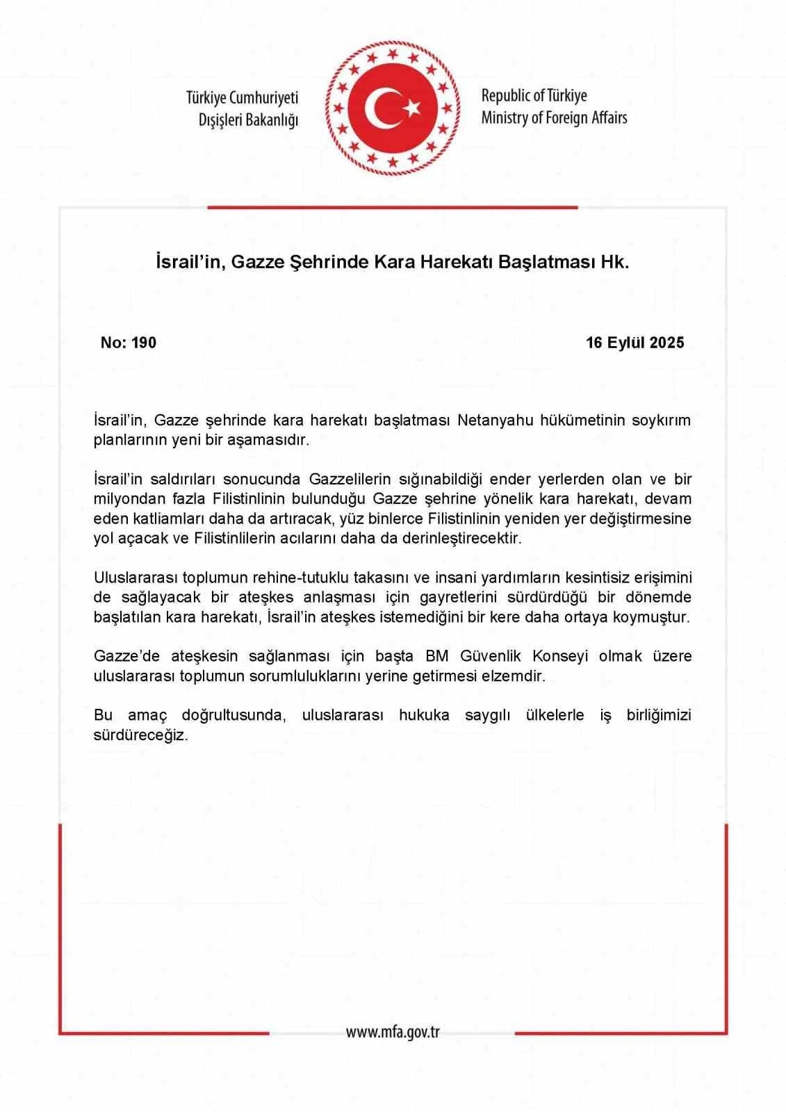 Dışişleri Bakanlığı, İsrail’in Gazze’ye kara harekatı başlatmasına ilişkin açıklama yaptı, Bakanlık tarafından yapılan açıklamada, "İsrail’in, Gazze şehrinde kara harekatı başlatması Netanyahu hükümetinin soykırım planlarının yeni bir aşamasıdır. İsrail’in saldırıları sonucunda Gazzelilerin sığınabildiği ender yerlerden olan ve bir milyondan fazla Filistinlinin bulunduğu Gazze şehrine yönelik kara harekatı, devam eden katliamları daha da artıracak, yüz binlerce Filistinlinin yeniden yer değiştirmesine yol açacak ve Filistinlilerin acılarını daha da derinleştirecektir" ifadeleri kullanıldı. "Başlatılan kara harekatı, İsrail’in ateşkes istemediğini bir kere daha ortaya koymuştur"