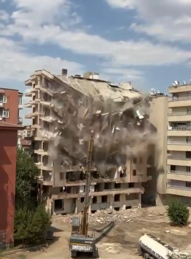 6 Şubat 2023 tarihinde meydana gelen Kahramanmaraş merkezli depremlerden etkilenen 11 ilden Diyarbakır’da ağır hasarlı binaların yıkımı devam ediyor. Merkez Yenişehir ilçesi Şehitlik Mahallesi’nde ağır hasarlı bir bina yıkım esnasında çöktü. Yıkımı izleyen vatandaşlar, binanın çökmesiyle kaçarak uzaklaştı. O anlar ise bir vatandaş tarafından cep telefonuyla görüntülendi.