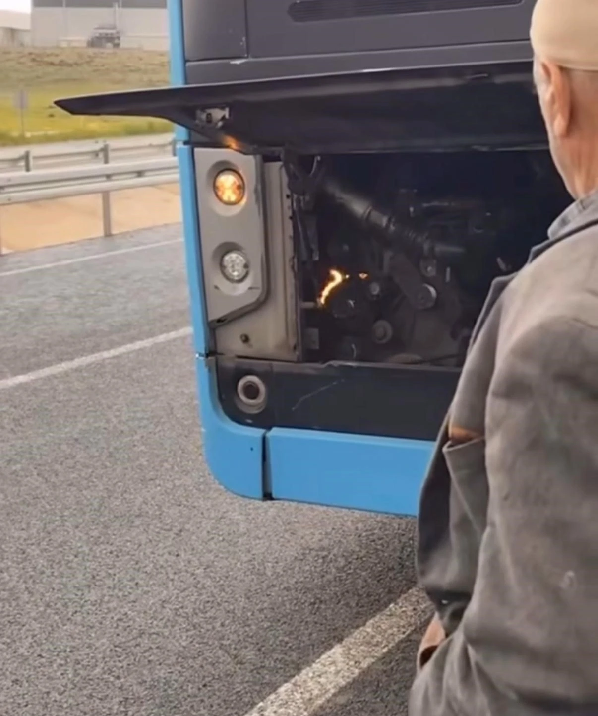 Motor kısmında çıkan arızada küçük çapta alev yükseldi. Otobüsten inen vatandaşlardan biri, yangını üfleyerek söndürmeye çalıştı.