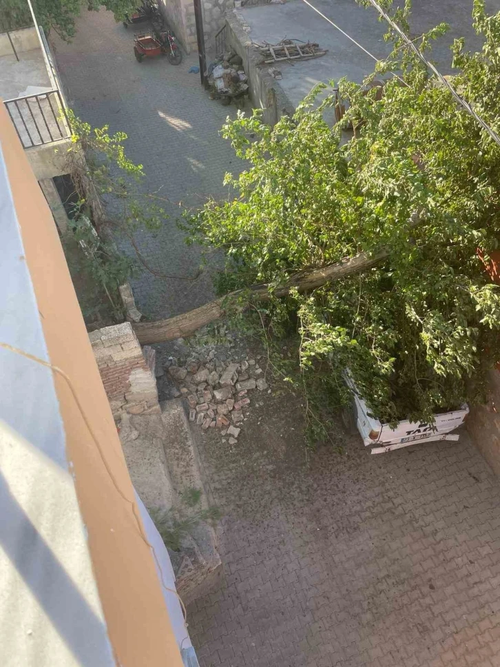 Diyarbakır’ın Çermik ilçesinde fırtınada yerinden sökülen ağaç, bir kamyonetin üstüne devrildi.