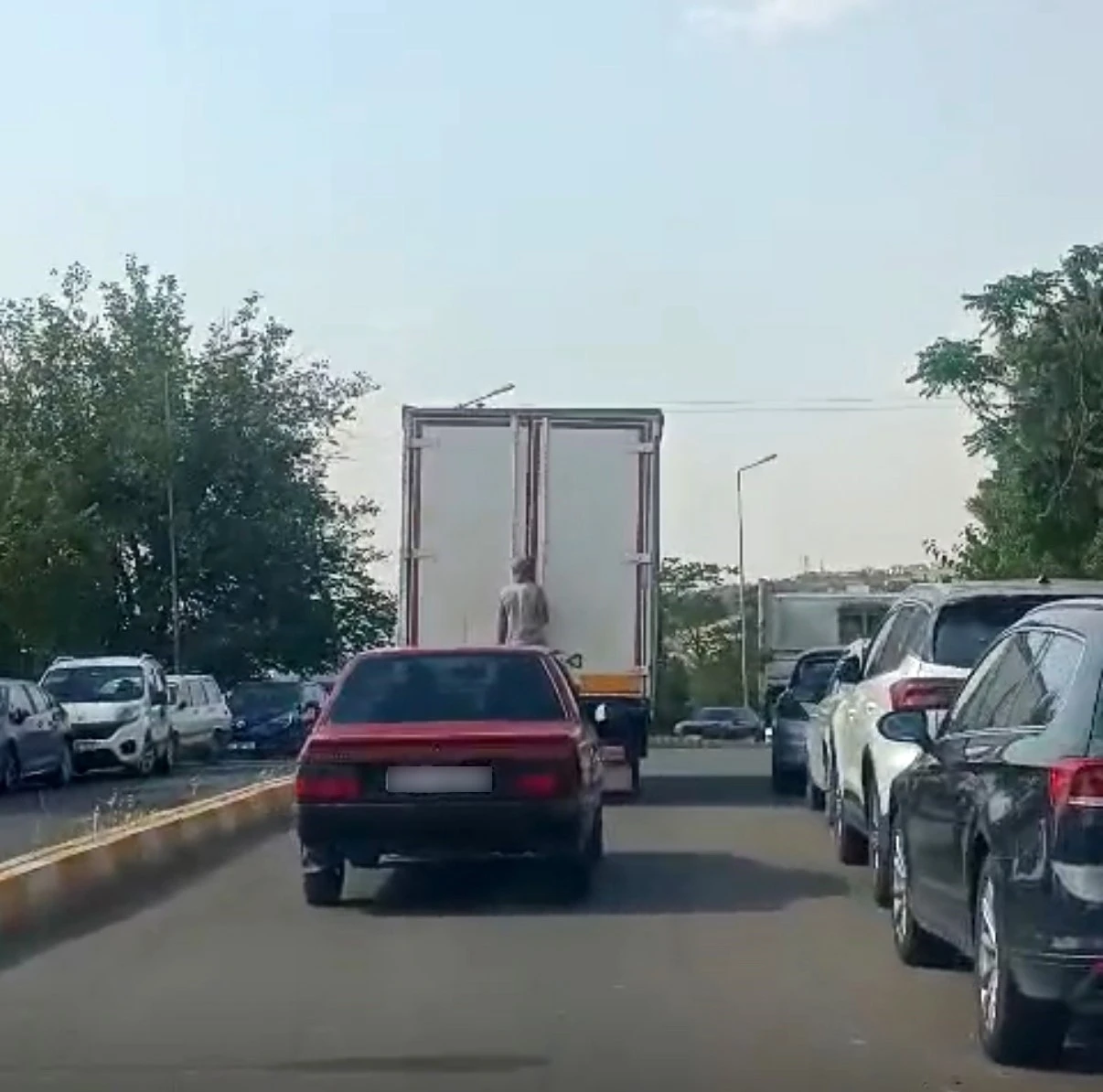 Diyarbakır’ın merkez Sur ilçesinde seyir halindeki kamyonetin arkasına tutunan şahsın tehlikeli yolculuğu, cep telefonu kamerasıyla görüntülendi.