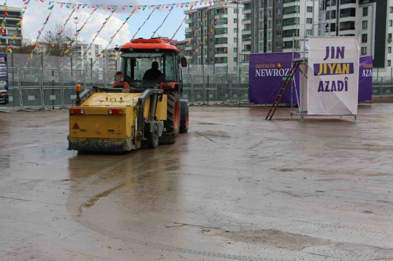 Diyarbakır’da yapılacak Nevruz kutlamaları öncesi hazırlıklar tamamlanma aşamasına gelindi. Bağlar ilçesindeki Nevruz Parkı’nda düzenlenecek kutlamalar sırasında yoğun güvenlik önlemleri alınacak. Kutlamaların yapılacağı 136 bin metrekarelik alan ve civarına 3 metre yüksekliğinde, 10 kilometre uzunluğunda polis bariyeri yerleştiriliyor.