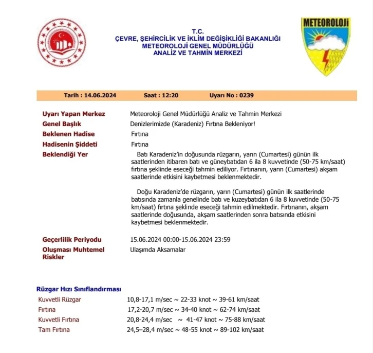 Meteoroloji 10. Bölge Müdürlüğü, Doğu ve Batı Karadeniz’de 15 Haziran Cumartesi kuvvetli rüzgar ve fırtına beklendiğini açıkladı. Açıklamada, "Batı Karadeniz’in doğusunda rüzgarın, 15 Haziran Cumartesi gününün ilk saatlerinden itibaren batı ve güneybatıdan 6 ila 8 kuvvetinde (saatte 50-75 km) fırtına şeklinde eseceği tahmin ediliyor. Fırtınanın aynı gün akşam saatlerinde etkisini kaybetmesi bekleniyor. Doğu Karadeniz’de ise rüzgarın, 15 Haziran Cumartesi günün ilk saatlerinde batısında zamanla genelinde batı ve kuzeybatıdan 6 ila 8 kuvvetinde (saatte 50-75) fırtına şeklinde eseceği tahmin edilmektedir. Fırtınanın, akşam saatlerinde doğusunda, akşam saatlerinden sonra batısında etkisini kaybetmesi beklenmektedir" denildi.