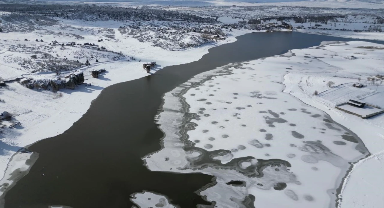 Hava sıcaklıklarının sıfır derecelerin altına düştüğü Afyonkarahisar’da donan Emre Gölü yanı başındaki tarihi eserler ile masalsı görüntüler oluşturdu.