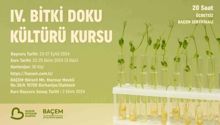 Bu yıl Balıkesir Büyükşehir Belediyesi Çiftçi Eğitim Merkezi (BAÇEM) tarafından dördüncüsü düzenlenecek olan Bitki Doku Kültürü Kursu başvuru tarihleri belli oldu. 23-27 Eylül günleri arasında toplamda 20 saat sürecek olan kursun, kursiyer açıklanma tarihi 2 Ekim olarak belirlendi. Kurs 23-25 Ekim günleri boyunca ücretsiz olarak BAÇEM’de gerçekleştirilecek.