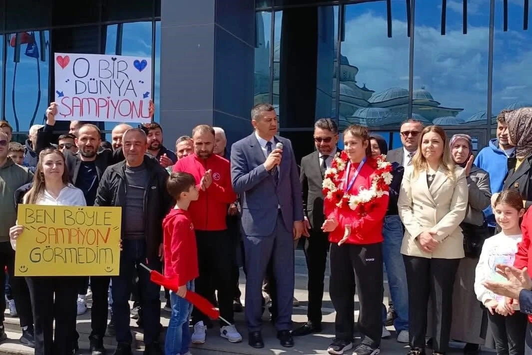 Burada Çorlu Gençlik ve Spor İlçe Müdürü Şenol Doğramacı, antrenörleri, ailesi ve arkadaşlarından oluşan davul zurna eşliğindeki coşkulu bir kalabalık tarafından karşılanan dünya şampiyonu sporcu, sevgi gösterileri eşliğinde konvoyla evine uğurlandı.