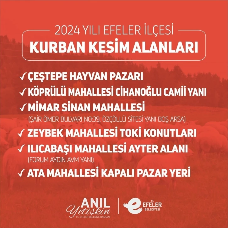 Bayram süresince kurban kesimlerinin hijyenik ve düzenli bir şekilde yapılması amacıyla yoğun bir çalışma yürüten Efeler Belediyesi, kurban kesim noktalarını belirledi. Efeler Belediyesi’nin sosyal medya hesaplarından yaptığı duyuruya göre; Çeştepe Hayvan Pazarı, Zeybek Mahallesi Toki Konutları, Köprülü Mahallesi Cihanoğlu Camii yanı, Ilıcabaşı Mahallesi Ayter Alanı (Forum Aydın AVM yanı), Ata Mahallesi Kapalı Pazar Yeri ve Mimar Sinan Mahallesi Şair Ömer Bulvarı No:39 Özçöllü Sitesi yanı boş arsa olarak belirlendi.
