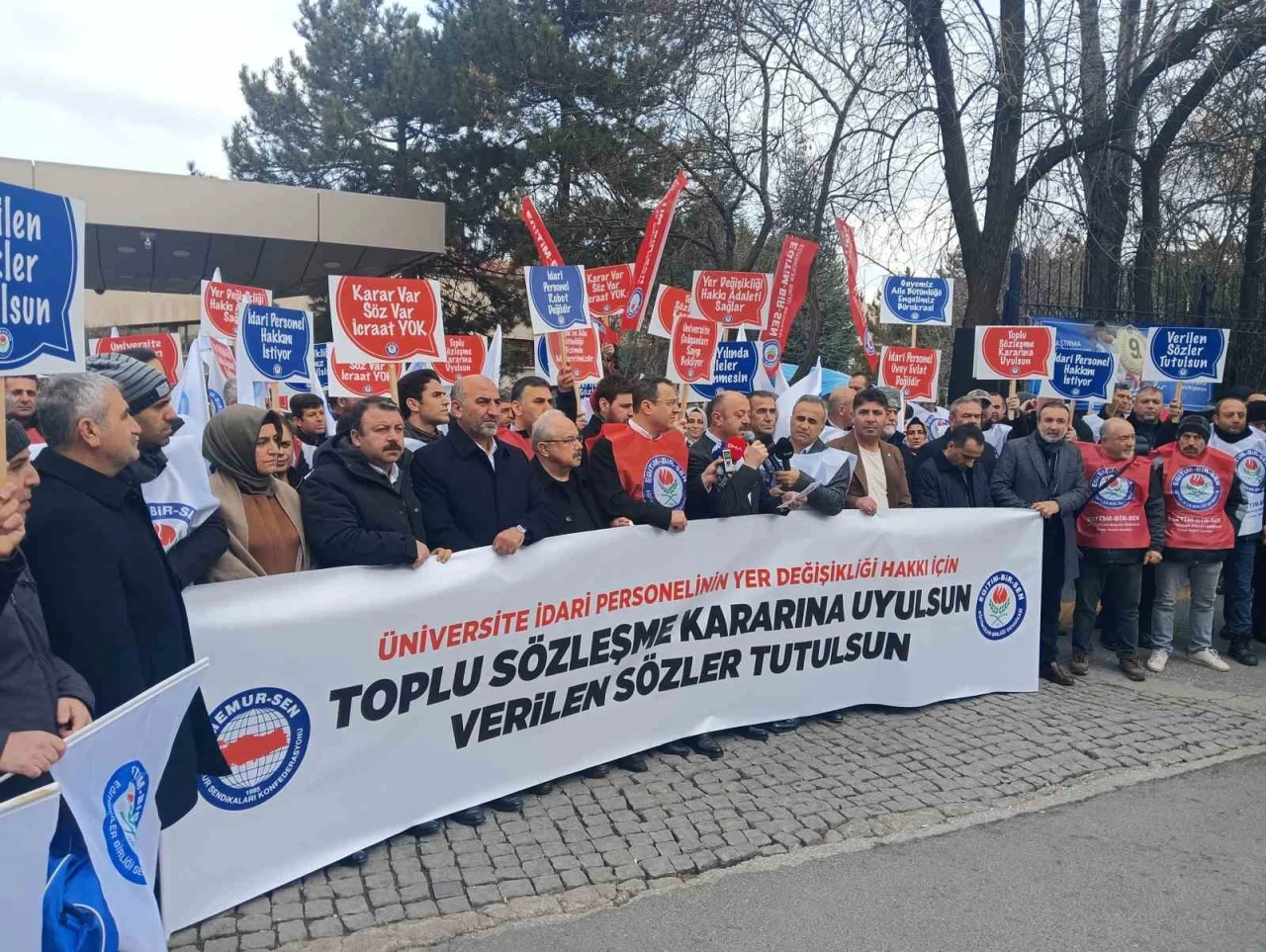 Eğitim Bir-Sen üyeleri, 81 ilde üniversite kampüsleri önünde üniversite personelinin haklarının iyileştirilmesi, 6. ve 7. toplu sözleşmelerdeki maddelerin hayata geçirilmesi ve yer değişikliği hakkı tanınması talebi ile basın açıklaması yaptı. Ankara Üniversitesi Beşevler Yerleşkesi önünde toplanan sendika üyeleri adına açıklama yapan Eğitim-Bir-Sen Genel Sekreteri Talat Yavuz, "6. ve 7. toplu sözleşme dönemlerinde imza altına aldığımız, ilgili kurumlarla birlikte çalıştığımız, YÖK tarafından da gerekli düzenlemesi yapılarak onaya sunulan haklı talebimizin geciktirilmesine, geçiştirilmesine artık tahammülümüz kalmamıştır. Üniversite idari personeli, 657 sayılı Devlet Memurları Kanunu’na tabi olarak istihdam edilmiş olmasına rağmen bakanlık ve taşra teşkilatı bulunan diğer kamu kurum ve kuruluşlarında çalışan idari personelin, kurumlar arasında yer değişikliğine benzer bir merkezi yer değişikliği hakkına sahip değildir. Üniversite idari personelinin başka bir üniversiteye geçebilmesi, kadrosunun bulunduğu üniversitenin iznine ve gideceği üniversitenin onayına bağlıdır. Bu iznin genellikle verilmemesi uzun dava süreçlerine neden olmakta, olumlu sonuçlanan davalar dahi personelin geçişini sağlamamaktadır. Hâlihazırda çoğu üniversite, diğer üniversitelere yer değişikliği yapmak isteyen idari personelinin bu taleplerini yönergeler aracılığıyla düzenlemektedir. Bunun yanında sendikamızın gayretleri sonucunda Eğitim, Öğretim ve Bilim Hizmet Kolu 6. ve 7. Dönem Kamu Görevlileri Toplu Sözleşmesi’nde idari personelin yükseköğretim kurumları arasında yer değişikliği konusunda taraflarca çalışma yapılması kararlaştırılmış; bu bağlamda YÖK ve Cumhurbaşkanlığı nezdinde çalışmalar yürütülmüş ise de henüz işleyen bir sistem ortaya konulamamıştır. Bu nedenle üniversite idari personelinin üniversiteler arası yer değişikliği işlemlerinin halen bir kısım üniversiteler tarafından yapılan, ancak hâliyle diğer üniversiteleri bağlamayan münferit yönergeler yerine toplu sözleşme hükmünden hareketle YÖK Başkanlığı eliyle üniversiteler arası merkezi yer değişikliğine imkan tanıyacak şekilde hukuki ve fiili bir düzenleme yapılması gereklidir. Biz, sorunlara çözüm üretilinceye kadar mücadele etmeye, yer değişikliği başta olmak üzer diğer taleplerimizi dile getirmeye devam edeceğiz. Çözümün adresi olanlardan, YÖK’ün özenle yaptığı çalışmayı hayata geçirmelerini, rektörlerimizden bu sürece katkı sunmalarını bekliyoruz" dedi.