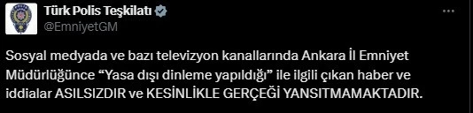 Emniyet Genel Müdürlüğünden yapılan açıklamada, "Sosyal medyada ve bazı televizyon kanallarında Ankara İl Emniyet Müdürlüğünce ’yasa dışı dinleme yapıldığı’ ile ilgili çıkan haber ve iddialar asılsızdır ve kesinlikle gerçeği yansıtmamaktadır" denildi.