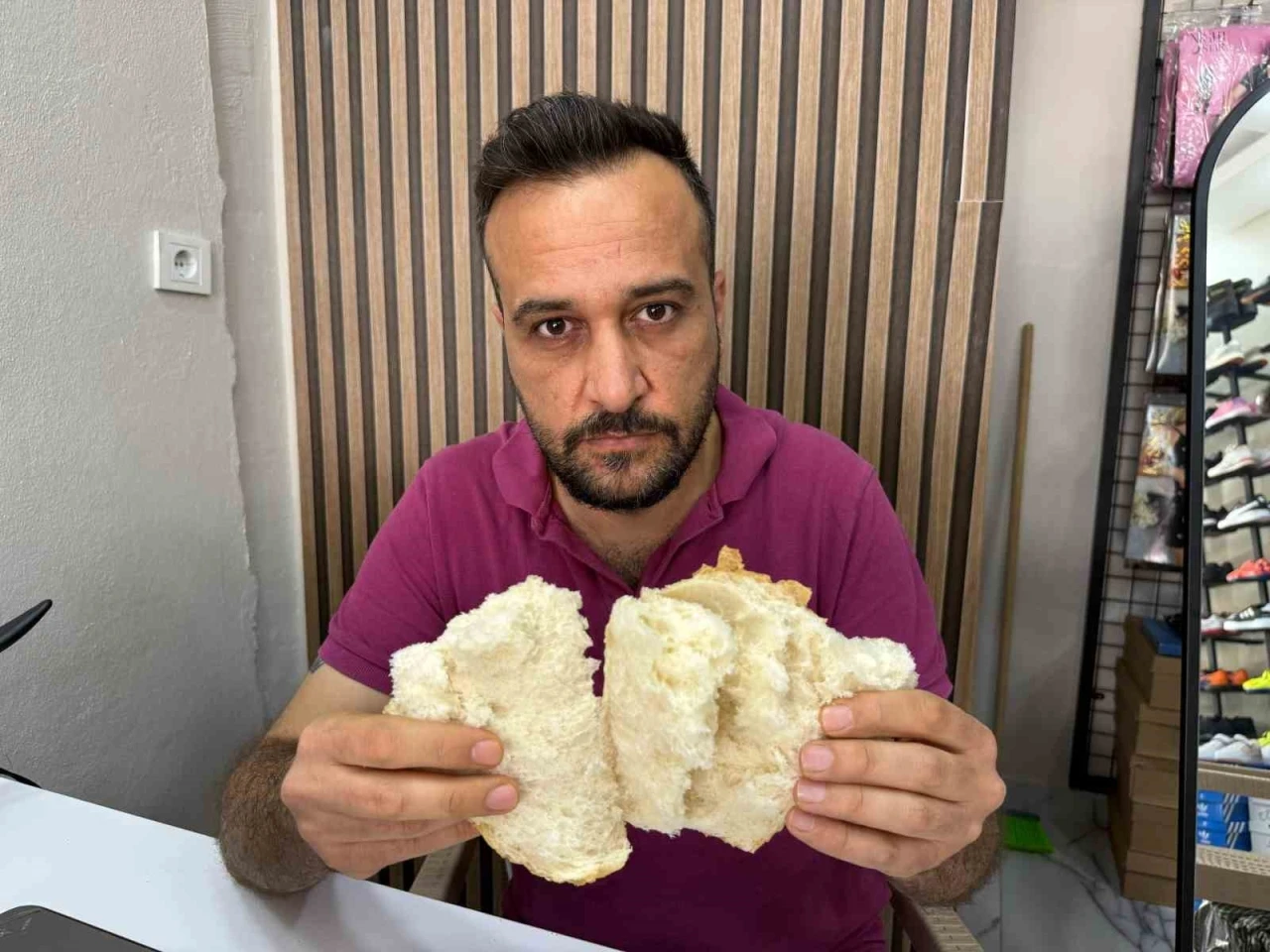 Hatay’ın Reyhanlı ilçesinde kahvaltı yapmak için zincir marketten ekmek alan ailenin ekmeğinden çivi çıktı. Eşinin ekmeği yediği esnada çivinin ağzına geldiğini ifade eden Mehmet Bozar, yaşananları anlattı.