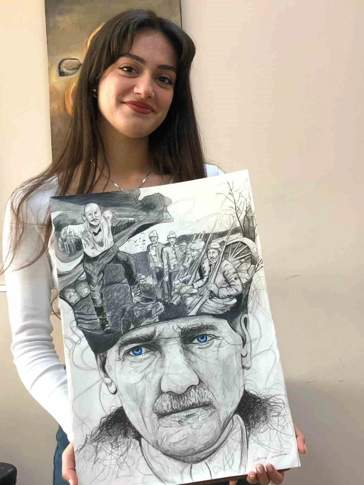 Elazığ’da 16 yaşındaki öğrenci Zehra Karaman’ın 18 Mart Şehitler Anma Günü ve Çanakkale Deniz Zaferi’nin 110. yıl dönümü dolayısıyla kara kalem sanatı ile yaptığı Atatürk portresi hayran bıraktı. Elazığ Gençlik ve Spor İl Müdürlüğü bünyesinde bulunan kurslarda eğitim alan 16 yaşındaki öğrenci Zehra Karaman, kara kalem çalışmaları ile dikkat çekiyor. Daha önce 24 Ocak 2020 Elazığ ve 6 Şubat 2023 Kahramanmaraş depremlerinin neden olduğu derin etkiyi sanatına yansıtan Karaman, kalemini bu kez de 18 Mart Şehitler Anma Günü ve Çanakkale Deniz Zaferi için konuşturdu. Karaman, kara kalem sanatı ile Atatürk portesi yaptı. Portre, görenlerden büyük beğeni aldı. Gençlik ve Spor İl Müdürü Abdulsamet Eren, "Gençlik merkezimizde sportif sanatsal anlamda kurslarımız mevcut. Bilinçsel düzeyden spora, spordan müziğe birçok kursumuzun olduğu ve özellikle resim branşından üç eğitmenimizle birlikte çocuklarımıza 12 ay boyunca kurs vermekteyiz. Bu kurslar, çocuklarımızın hayal gücünü geliştirmekte. Böylece, çocuklarımızın küçük yaşta gelişimlerini sağlayıcı birçok etkisinin olduğunu ifade edebiliriz. Zehra öğrencimizde bu kurslarımızda yetişen bir kardeşimiz. Bu günün anlamına özel bir çalışma sergiledi. Kendisi ve eğitmeni, Sıdıka Kopar hocamızı tebrik ederim" dedi.