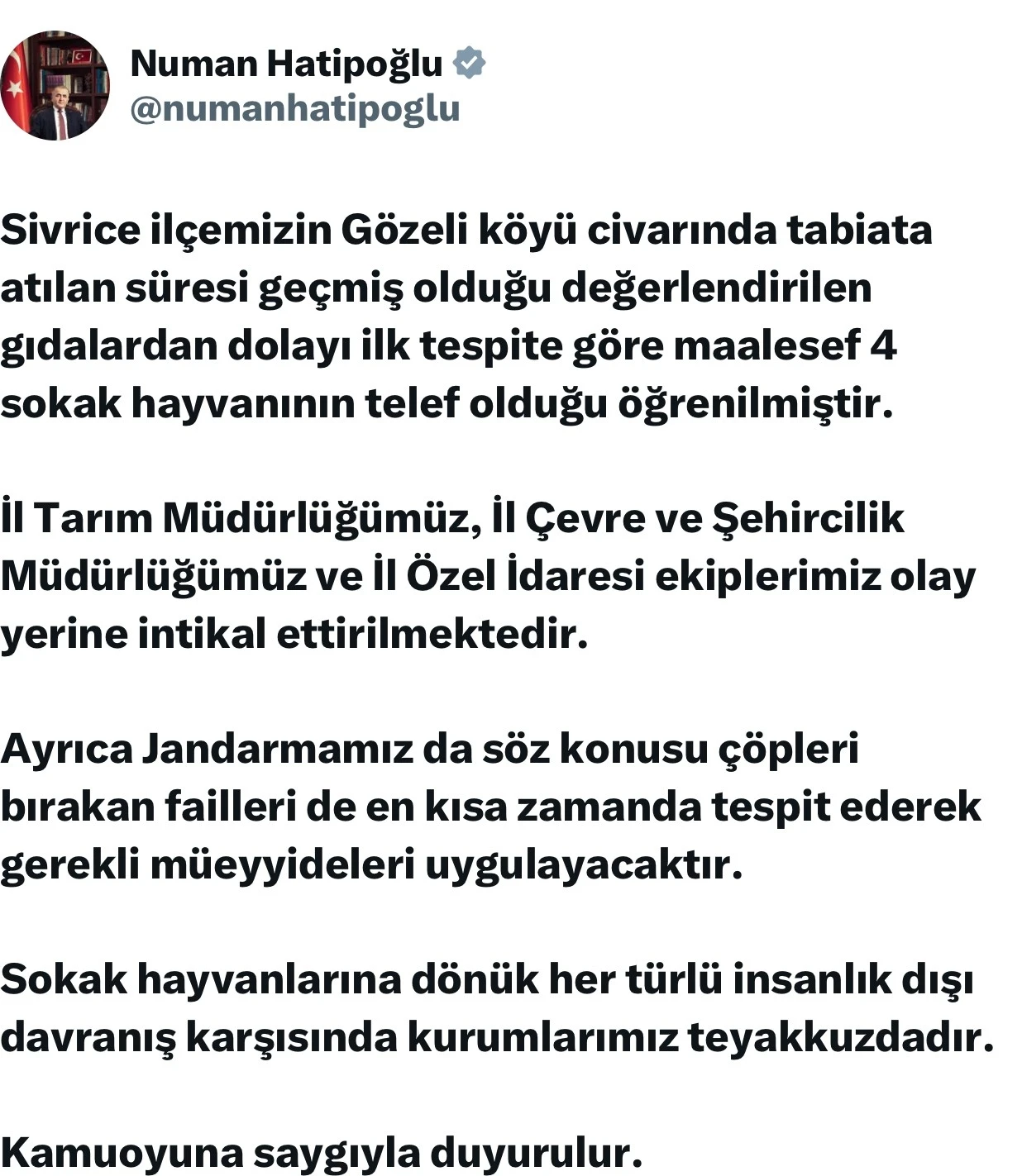 Sivrice ilçesi Gözeli köyü civarında, doğaya atılan süresi geçmiş gıdalardan dolayı ilk tespite göre 4 sokak hayvanının telef olduğu bildirildi. Konuyla ilgili Vali Numan Hatipoğlu açıklamalarda bulundu. Vali Hatipoğlu, olayın ardından Tarım ve Orman Müdürlüğü, Çevre Şehircilik ve İklim Değişikliği Müdürlüğü ve İl Özel İdaresi ekiplerinin hızla olay yerine intikal ettirilerek gerekli incelemelerin başlatıldığını duyurdu. Vali Hatipoğlu ayrıca, jandarma ekiplerinin de çöpleri atan kişilerin tespit edilmesi ve gerekli müeyyidelerin uygulanması için çalışmalarına devam ettiğini belirtti.