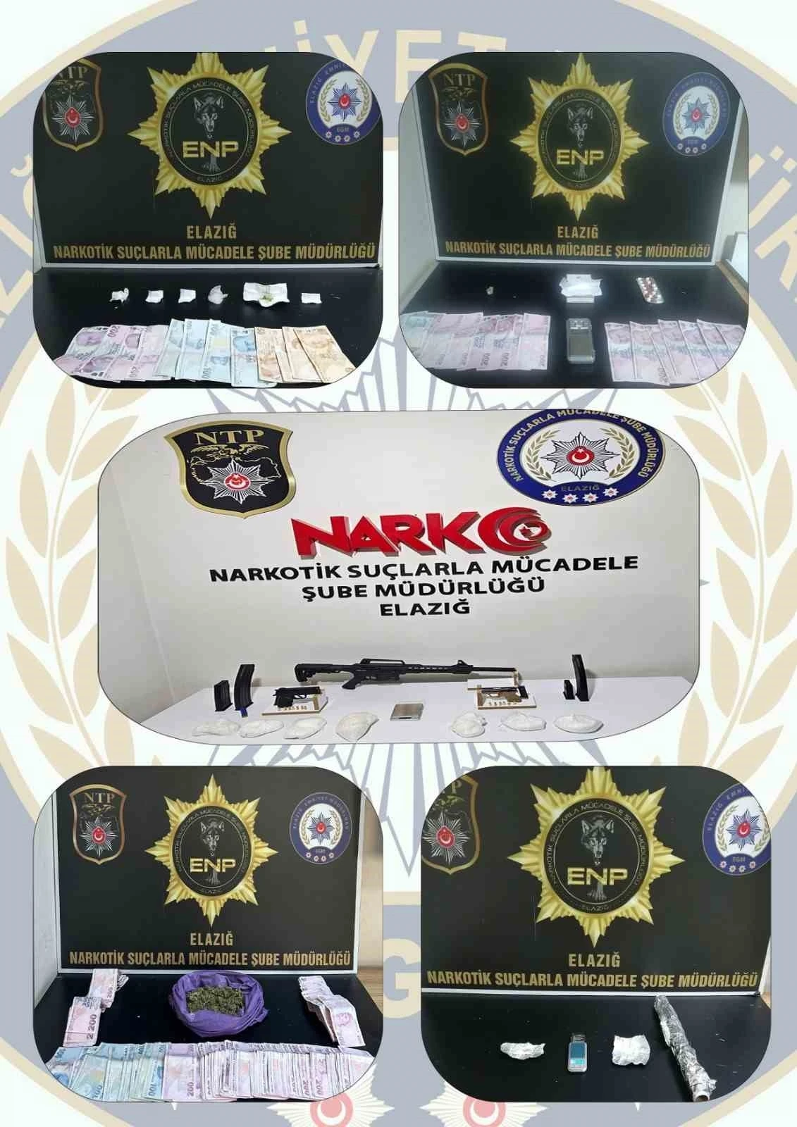 Elazığ Cumhuriyet Başsavcılığı koordinesinde İl Emniyet Müdürlüğü Narkotik Suçlarla Mücadele Şube Müdürlüğü tarafından, uyuşturucu ile mücadele kapsamında uyuşturucu madde kullanan şahıslara ve sokak satıcılarına yönelik çalışmalar sürüyor. Bu çerçevede son bir hafta içerisinde yapılan operasyonlarda; 15 parça halinde 2 kilo 199 gram metamfetamin maddesi, 3 parça halinde 69,87 gram esrar maddesi, 14 adet sentetik ecza maddesi, 2 adet ruhsatsız tabanca ve tabancalara ait 13 adet fişek, 1 adet pompalı tüfek, 4 adet tüfeğe ait şarjör ve 1 adet kartuş, 2 adet hassas terazi, uyuşturucu madde ticaretinden elde edildiği değerlendirilen 31 bin 100 Türk Lirası ele geçirildi.