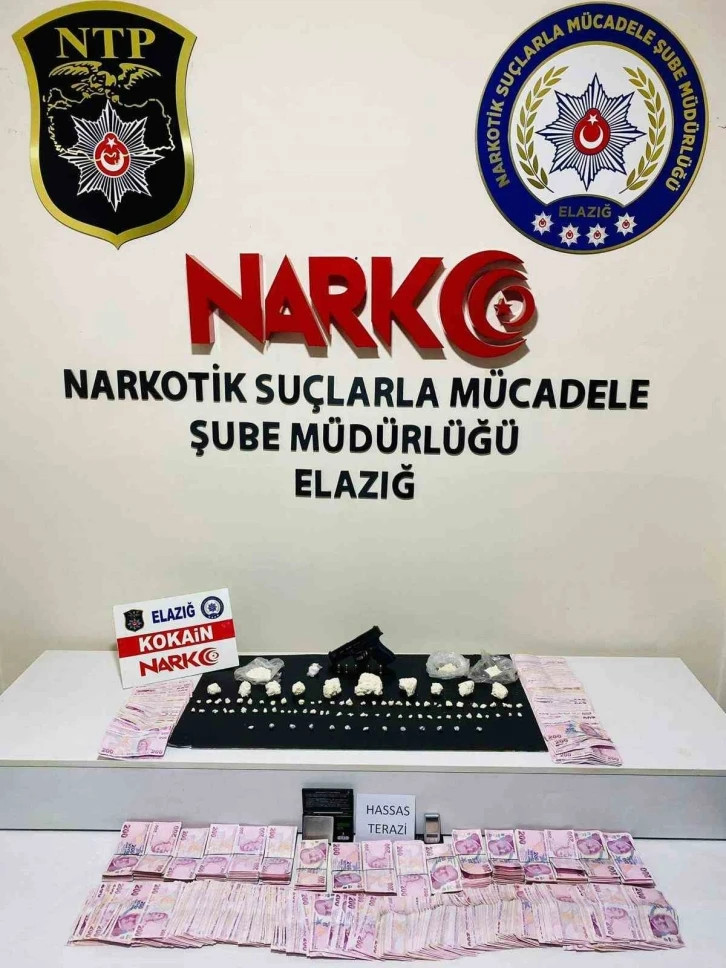 Elazığ Cumhuriyet Başsavcılığı koordinesinde İl Emniyet Müdürlüğü Narkotik Suçlarla Mücadele Şube Müdürlüğü tarafından uyuşturucu ile mücadele kapsamında sokak satıcılarına yönelik operasyon yapıldı. Operasyonda 2 şüpheli yakalanarak gözaltına alındı. Yapılan aramada 95 parça halinde 450 gram taş kokain maddesi, 2 adet hassas terazi, 1 adet ruhsatsız tabanca ve tabancaya ait 5 adet fişek ile uyuşturucu ticaretinden elde edildiği değerlendirilen 386 bin lira ele geçirildi.