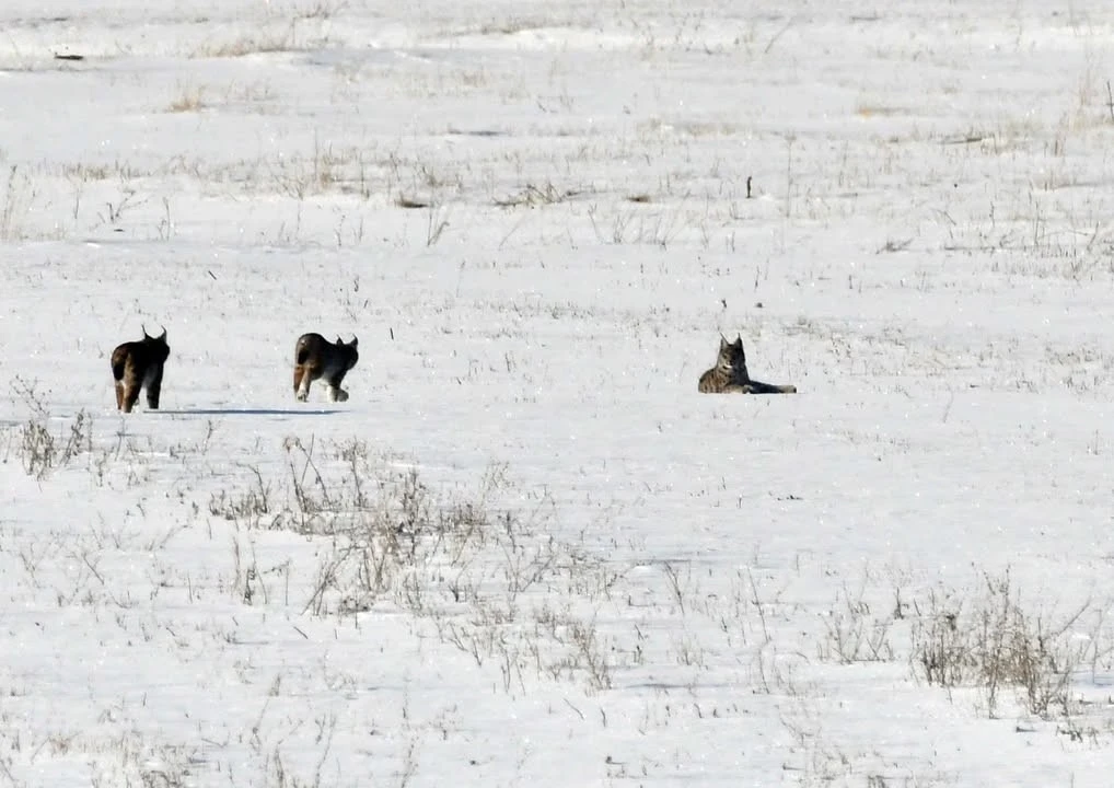 Bölgede etkili olan kar yağışı sonrası doğada yiyecek bulmakta zorlanan vaşak ailesinin köy kırsalına kadar indiği görüldü. Bir süre kar üzerinde ilerleyen vaşaklar, daha sonra gözden kayboldu.