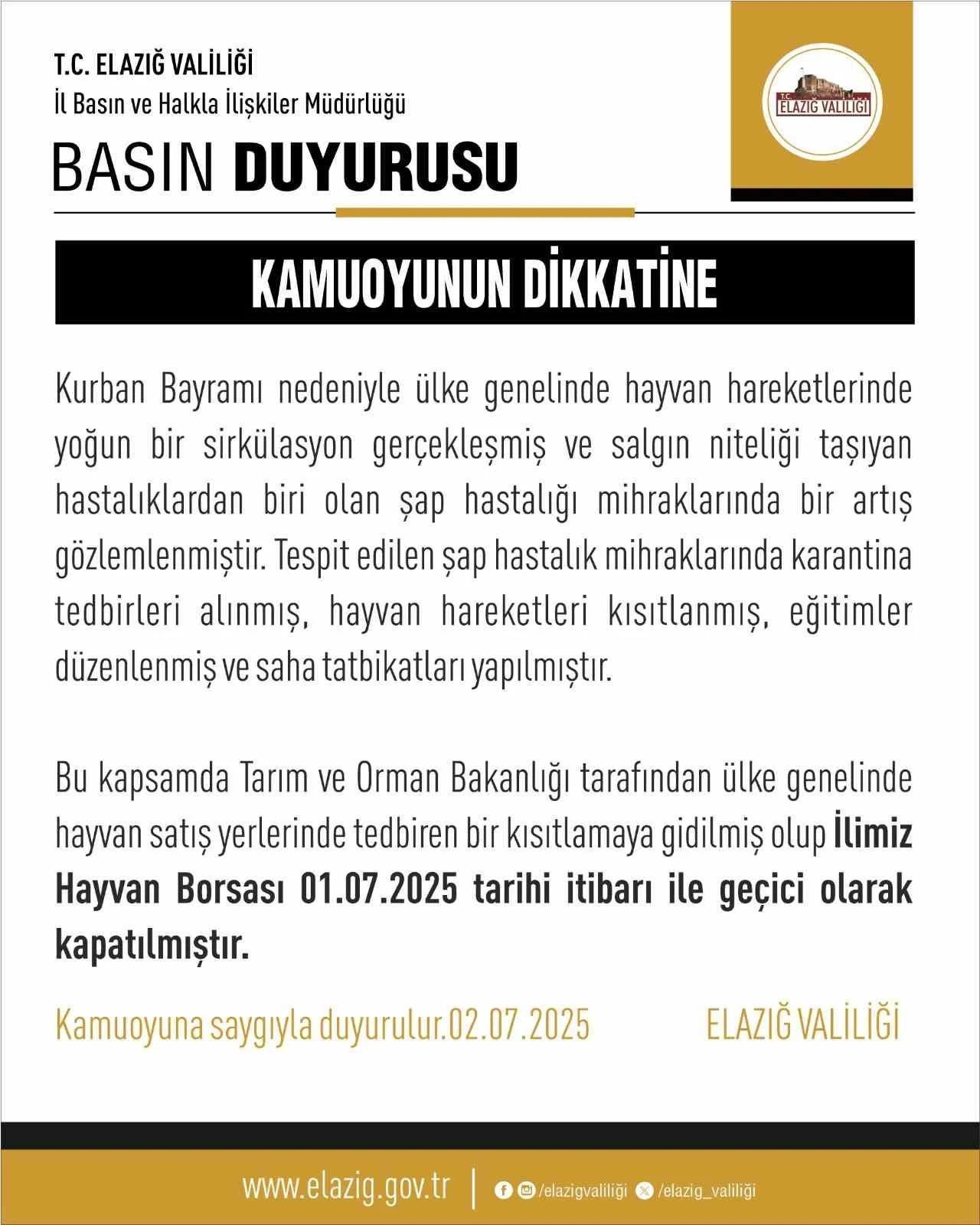 Elazığ Valiliğinden yapılan açıklamada, Kurban Bayramı nedeni ile ülke genelinde hayvan hareketlerinde yoğun bir sirkülasyon gerçekleştiği ve salgın niteliği taşıyan hastalıklardan biri olan şap hastalığı mihraklarında bir artış gözlemlendiği belirtildi. Açıklamada, ’’Tespit edilen şap hastalık mihraklarında karantina tedbirleri alınmış, hayvan hareketleri kısıtlanmış, eğitimler düzenlenmiş ve saha tatbikatları yapılmıştır. Bu kapsamda Tarım ve Orman Bakanlığı tarafından ülke genelinde hayvan satış yerlerinde tedbiren kısıtlamaya gidilmiş olup ilimiz Hayvan Borsası 1 Temmuz 2025 tarihi itibari ile geçici olarak kapatılmıştır’’ denildi.