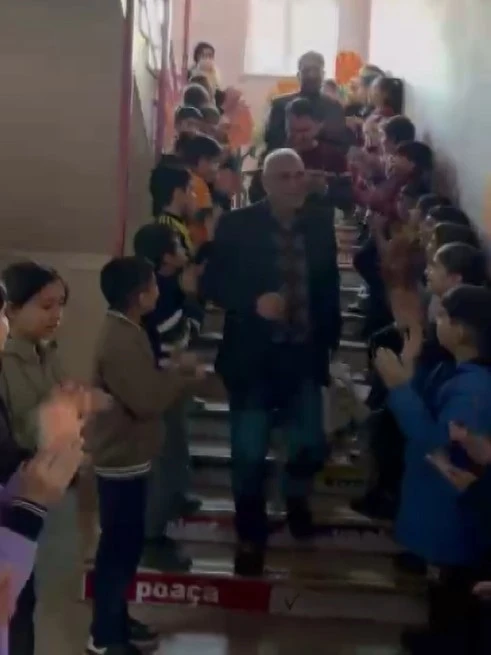 Gaziantep’in İslahiye ilçesinde 35 yıl görev yaptığı okulda emekliye ayrılan hizmetli Celal Kömür, öğrenci ve öğretmenler tarafından oluşturulan insan koridoruyla, alkışlarla ve tezahüratlarla uğurlandı.