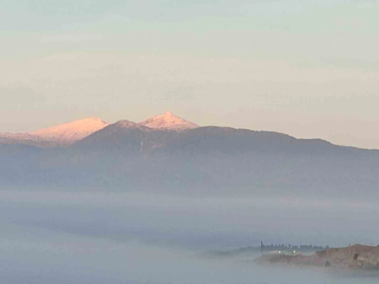 "Dün de kısmen kar vardı ancak sisten tam görünmüyordu. Bugün hava az açınca o anı çektim cep telefonumla."