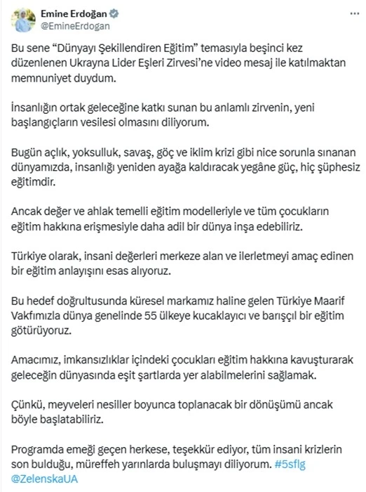 Bu sene ’Dünyayı Şekillendiren Eğitim’ temasıyla beşinci kez düzenlenen Ukrayna Lider Eşleri Zirvesi’ne video mesaj ile katılmaktan duyduğu memnuniyeti dile getiren Emine Erdoğan, paylaşımında şu ifadelere yer verdi: