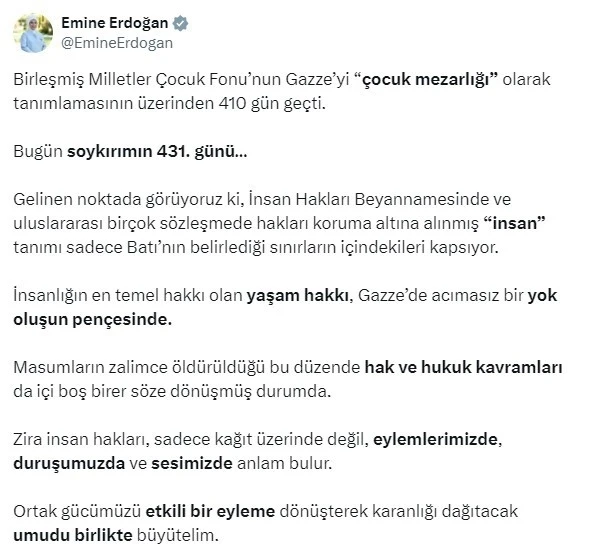 Emine Erdoğan, 10 Aralık Dünya İnsan Hakları Günü dolayısıyla sosyal medya hesabından yaptığı paylaşımda, Birleşmiş Milletler Çocuk Fonu’nun Gazze’yi "çocuk mezarlığı" olarak tanımlamasının üzerinden 410 gün geçtiğini, bugün soykırımın 431’inci günü olduğunu belirtti.