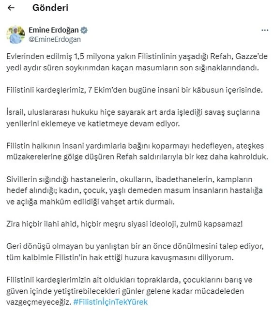 Cumhurbaşkanı Recep Tayyip Erdoğan’ın eşi Emine Erdoğan, İsrail’in Refah’a yönelik saldırılarıyla bir kez daha kahrolduklarını belirterek, sivillerin sığındığı hastanelerin, okulların, ibadethanelerin, kampların hedef alındığı, kadın, çocuk, yaşlı demeden masum insanların hastalığa ve açlığa mahkum edildiği vahşetin durması çağrısında bulundu.